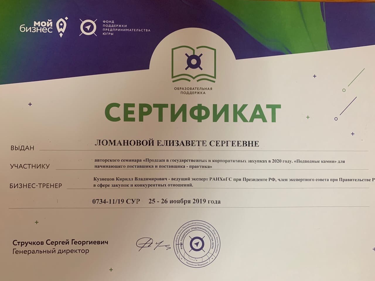 25 и 26 ноября 2019 года на базе Сургутской Торгово-промышленной палаты проходила работа Двухдневного практического авторского обучающего семинара К.В. Кузнецова (ведущего эксперта РАНХиГС при Президенте РФ, члена экспертного совета при Правительстве РФ в сфере закупок и конкурентных отношений) по 44-ФЗ и 223-ФЗ по теме: «Продажи в государственных и корпоративных закупках в 2020 году. «Подводные камни» для начинающего поставщика и поставщика - практика». Организаторами мероприятия выступили Фонд поддержки предпринимательства Югры и Сургутская ТПП, обучение проводилось бесплатно.
