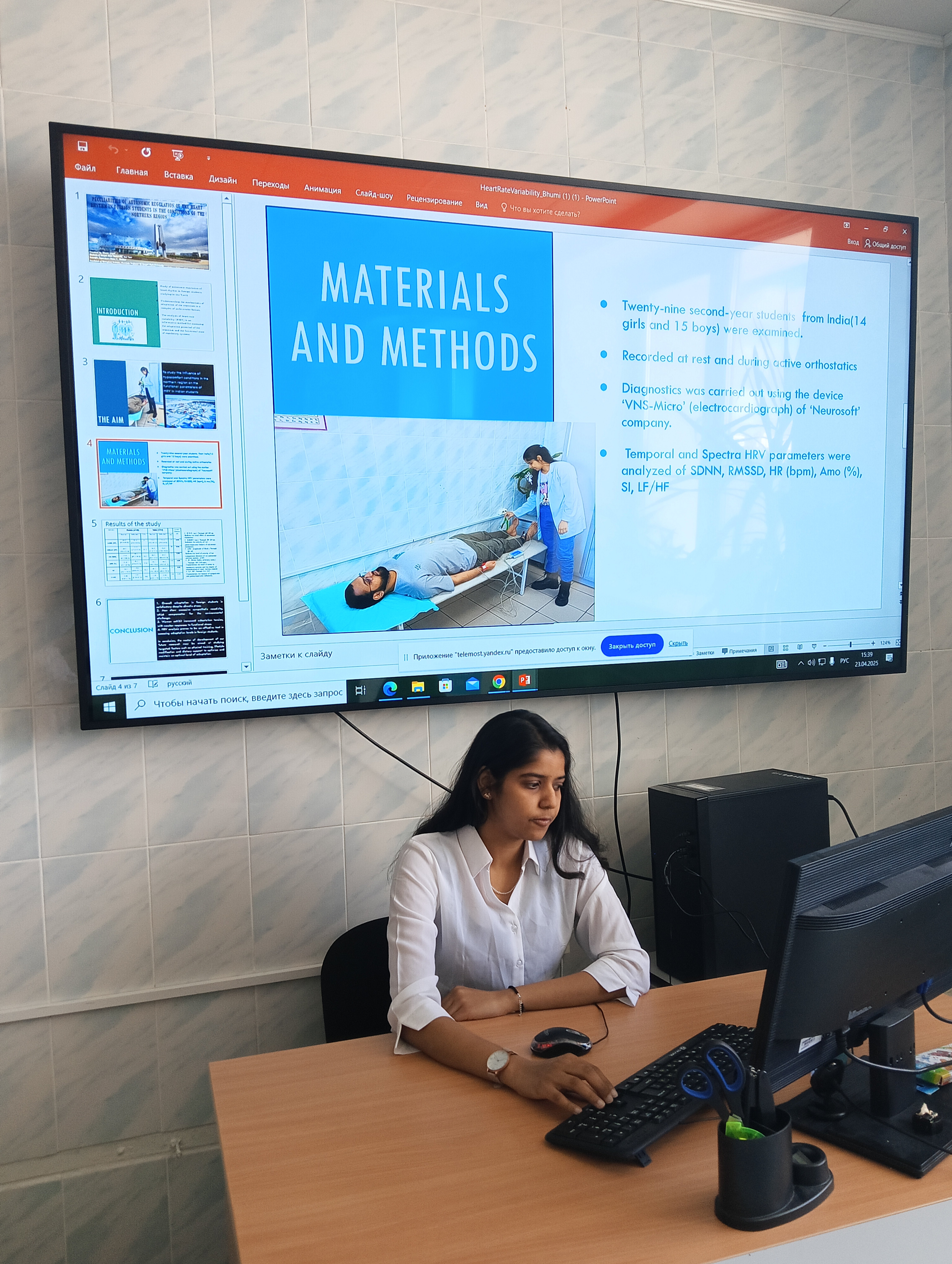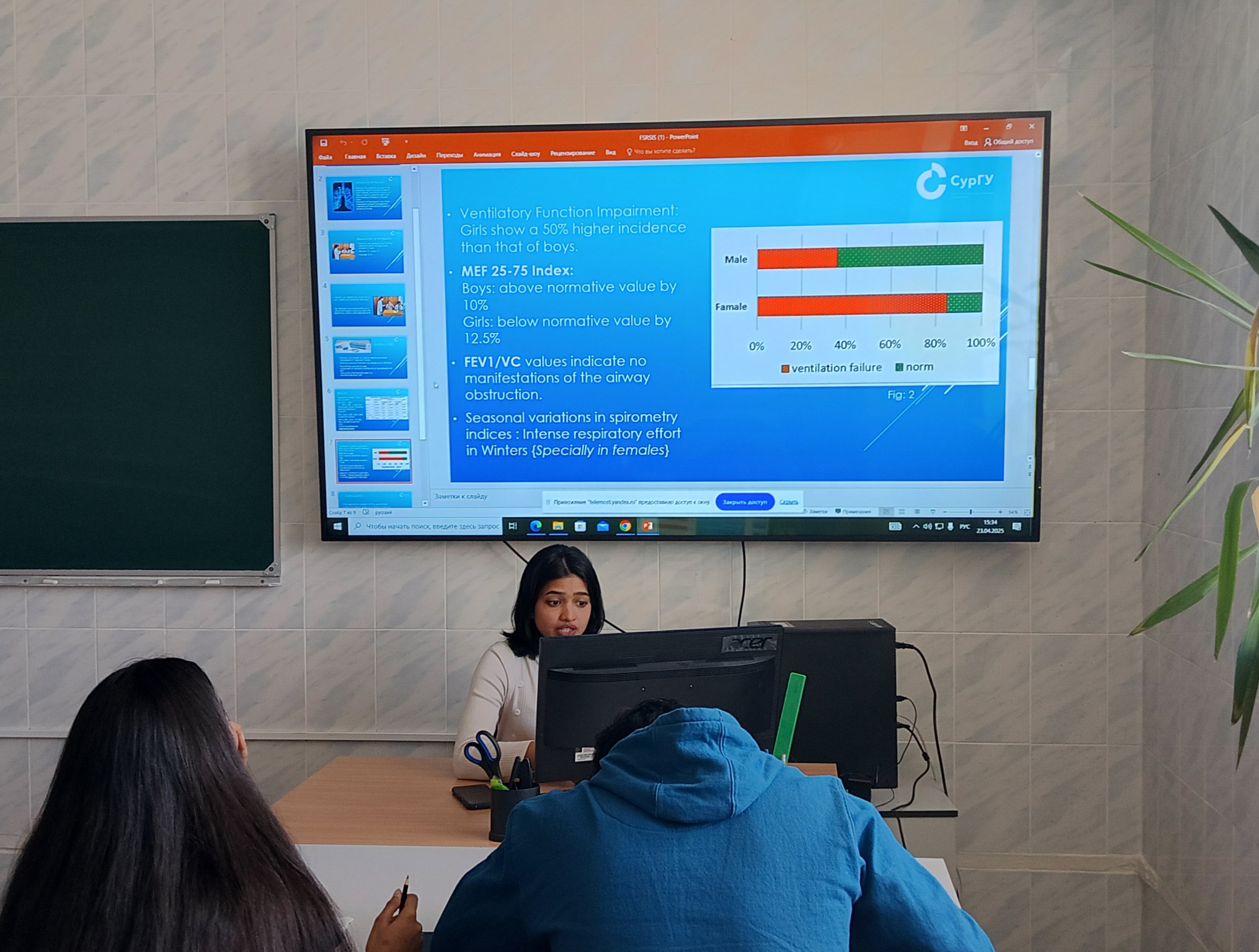 Под руководством кандидата биологических наук, доцента кафедры морфологии и физиологии Виктора Мальцева студенты СурГУ подготовили и представили два актуальных доклада на английском языке: исследование "Respiratory system reserves of Indian students in the hypocomfort conditions of a northern region" («Резервы дыхательной системы индийских студентов в гипокомфортных условиях северного региона»), которое представили Джиль Порвал и Мадху Саини, студенты третьего курса Медицинского института, – исследование посвящено изучению адаптационных возможностей дыхательной системы иностранных студентов из Индии в суровых климатическим условиях северного региона России; доклад "Peculiarities of autonomic regulation of heart rhythm in foreign students in the conditions of the northern region" («Особенности вегетативной регуляции сердечного ритма у иностранных студентов в условиях северного региона»), который представила студентка второго курса Бхуми Гоял, – в работе рассматриваются особенности адаптации сердечно-сосудистой системы и механизмы вегетативной регуляции сердечного ритма у иностранных студентов при акклиматизации к северным условиям проживания.