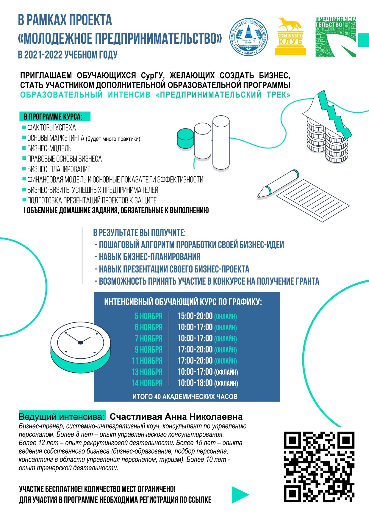 В рамках проекта «Молодежное предпринимательство» в 2021–2022 учебном году приглашаем обучающихся СурГУ, желающих создать бизнес, стать участником дополнительной образовательной программы Образовательный интенсив «Предпринимательский трек».